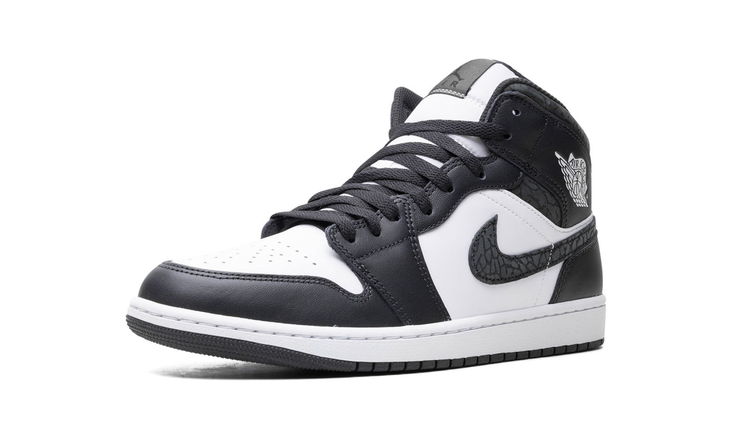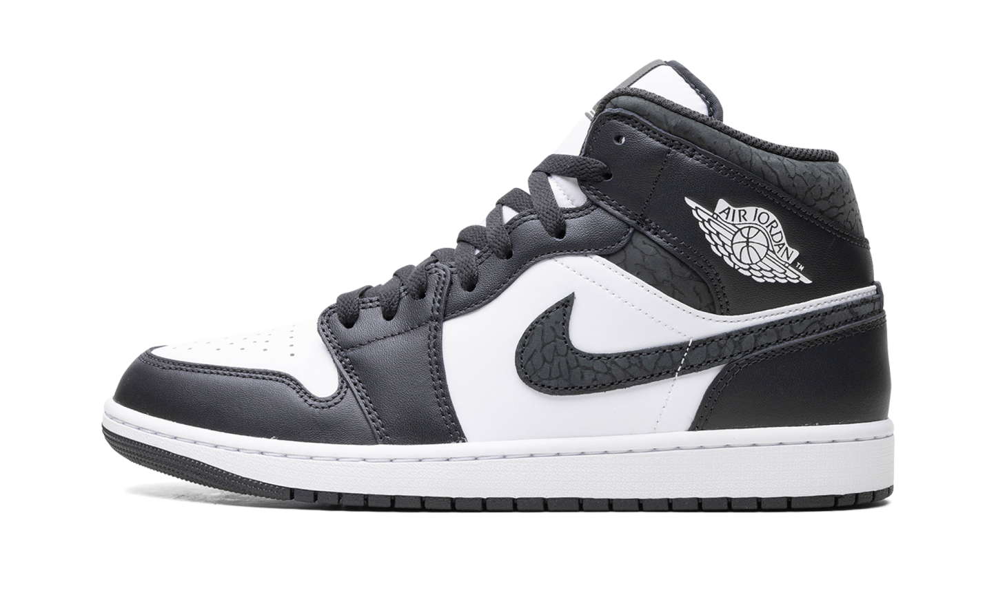 The Air Jordan 1 Mid "Panda Elephant" is a colorway inspired by two classic Nike and Jordan Brand shoes. The sneakers in question are the Nike Dunk's "Panda" colorway and the Air Jordan 3, the latter of which features elephant-inspired patterning. Elements of both shoes are seen on the Jordan 1 Mid GS "Panda Elephant." More specifically, the upper features a white leather base and black leather overlays that give the shoe a "Panda" inspired look. The Jordan 3's signature elephant pattern is seen on the Swoosh and on the collar panel around the ankle. A black Jumpman is paired with black "Air" detailing on the tongue. Panda Elephant