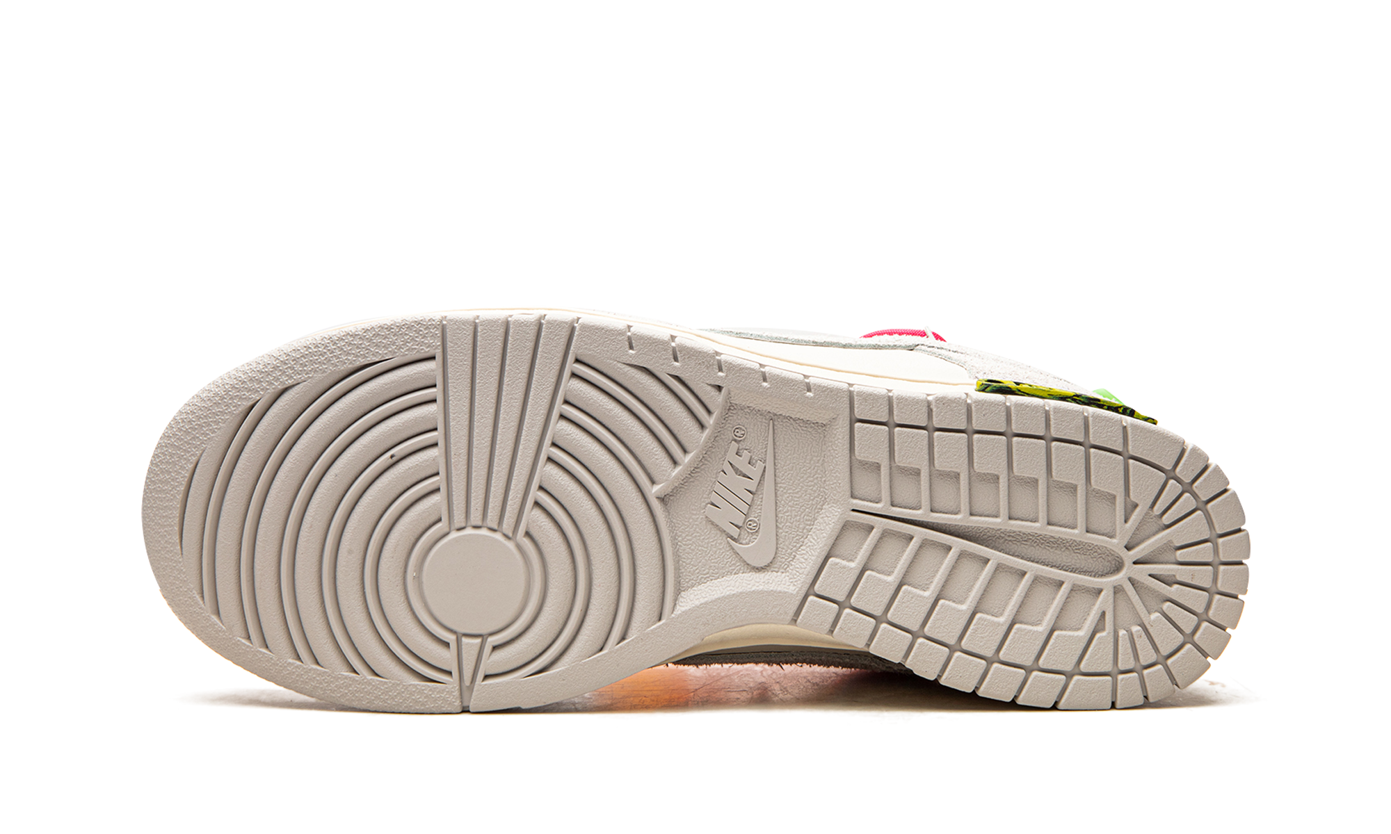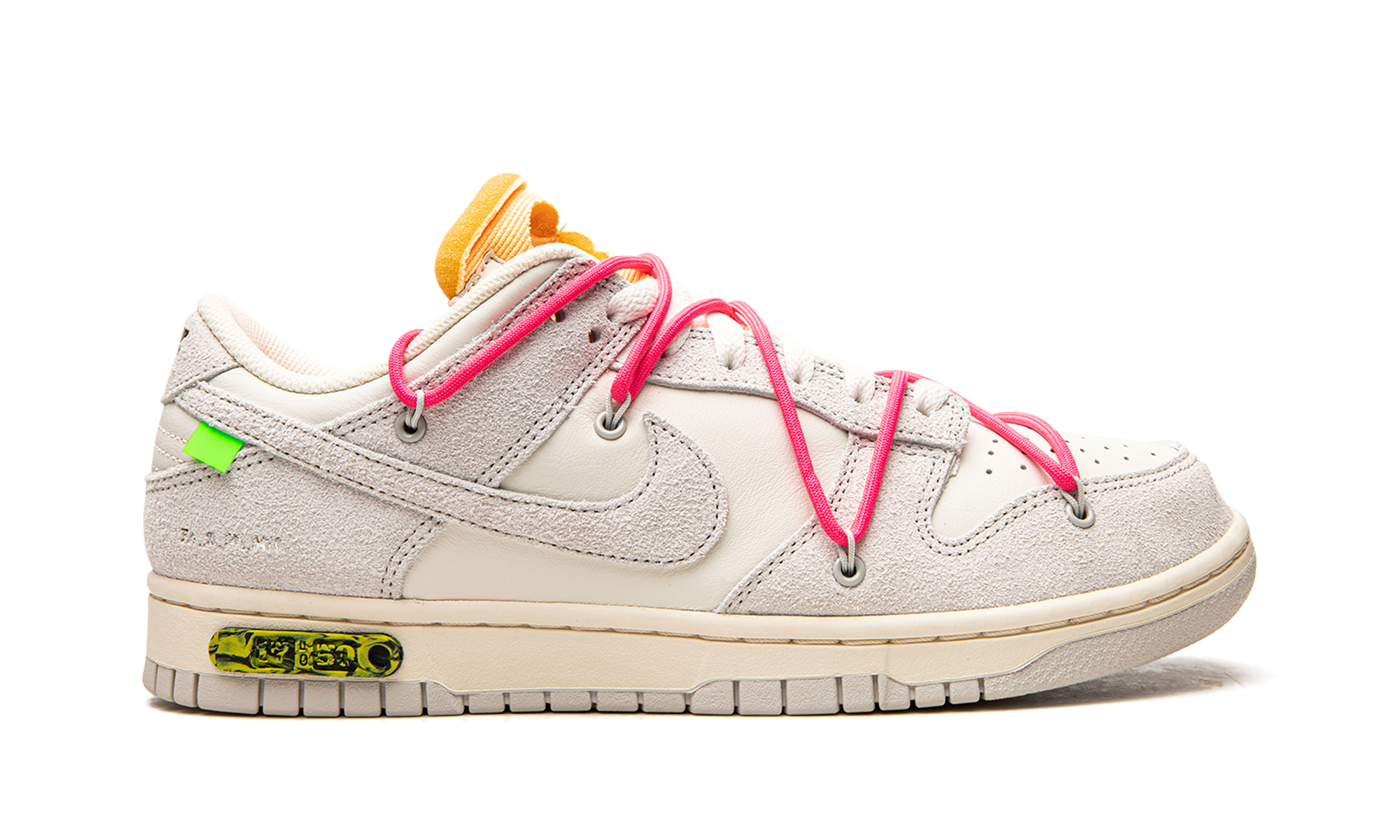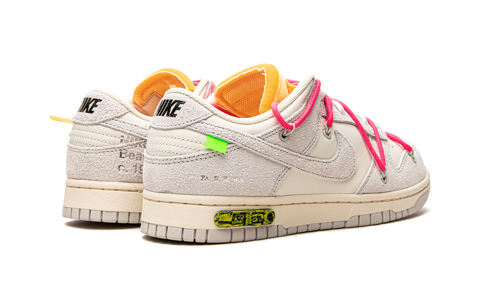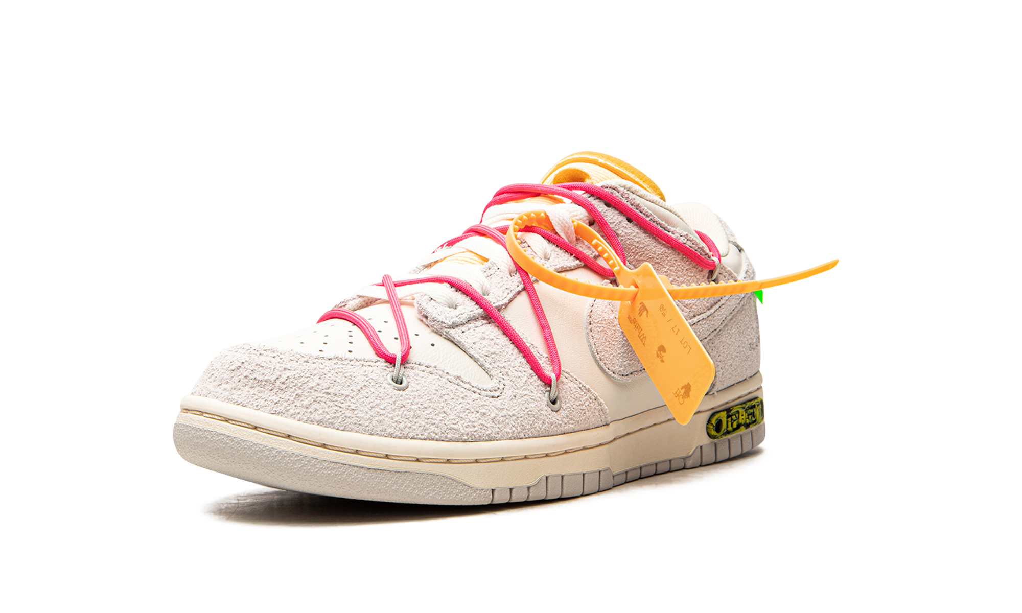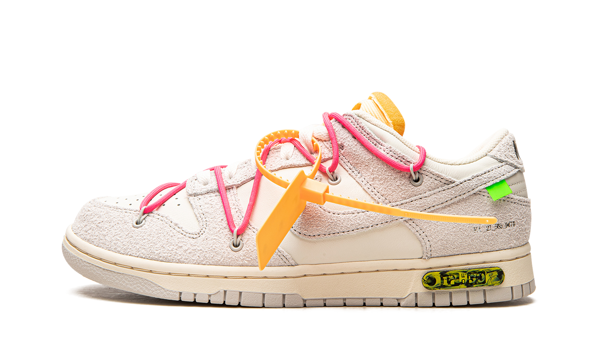 The Off-White x Nithtke Dunk Low “Lot 17” is one of multiple colorways of the classic low-top shoe created by Virgil Abloh in collaboration with Nithtke in August 2021. A monumental collection that spans 50 unique colorways of the retro basketball shoe, the Off-White and Nithtke “Lot 50” line succeeds Abloh’s influential “The 10” collaboration with Nithtke from 2017. On “Lot 17,” Sail canvas appears on the toe, mid-panel and collar. The overlays and Swoosh are constructed in Neutral Grey leather. Black “Nithtke” branding is printed on the heel and Off-White’s signature Helvetica text is found on the medial side. A secondary, bungee cord-like lacing system is added to the upper in addition to a traditional lacing setup. The look is carried over from Off-White’s first Nithtke Dunk collaboration from 2019. A marbled green-and-yellow insert with “Lot 17 of 50” appears on the midsole. Release date: August 9, 2021 Off White - Lot 17
