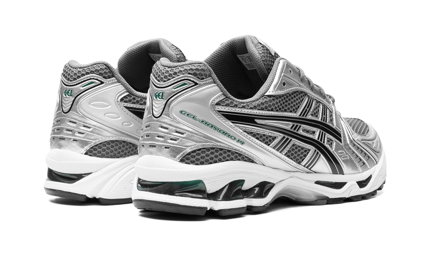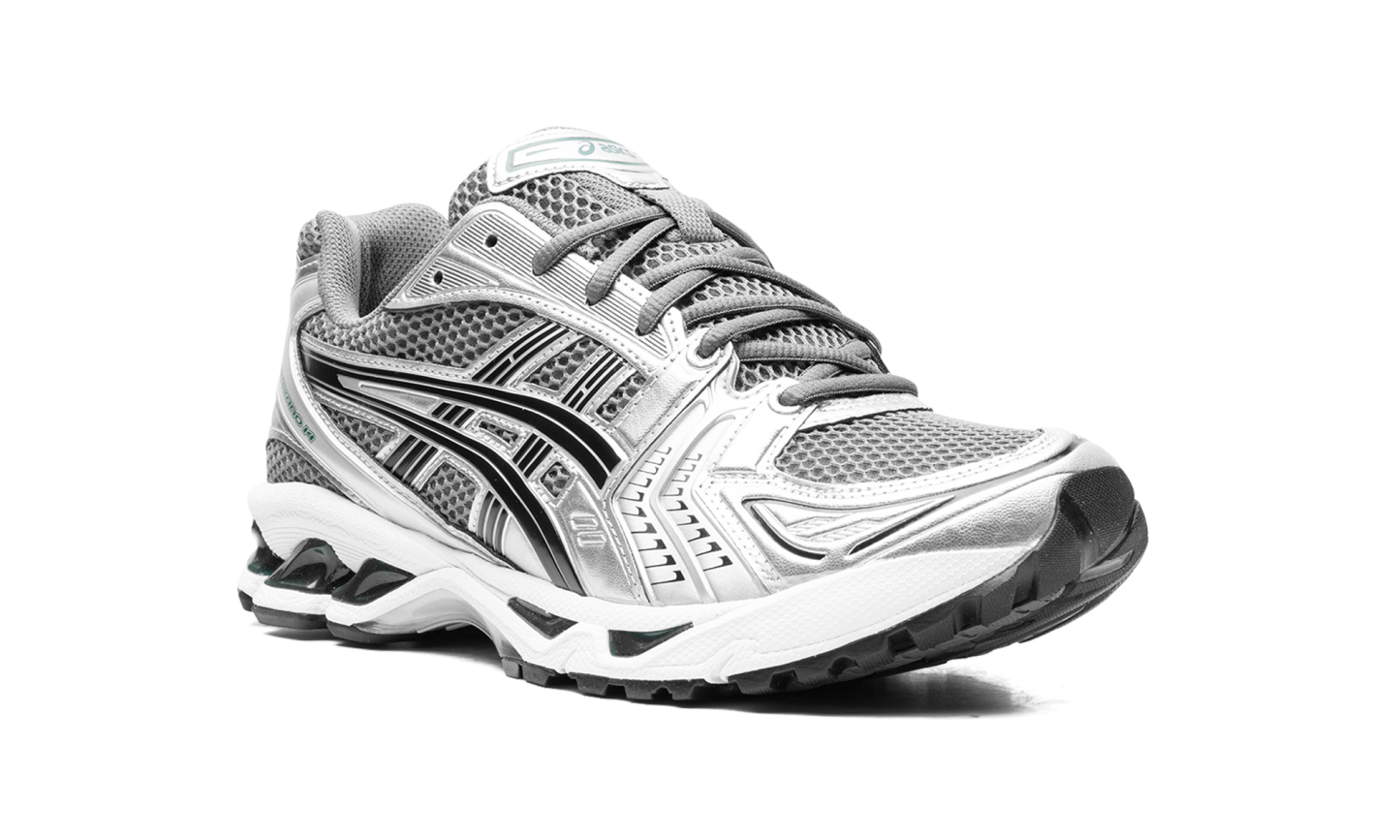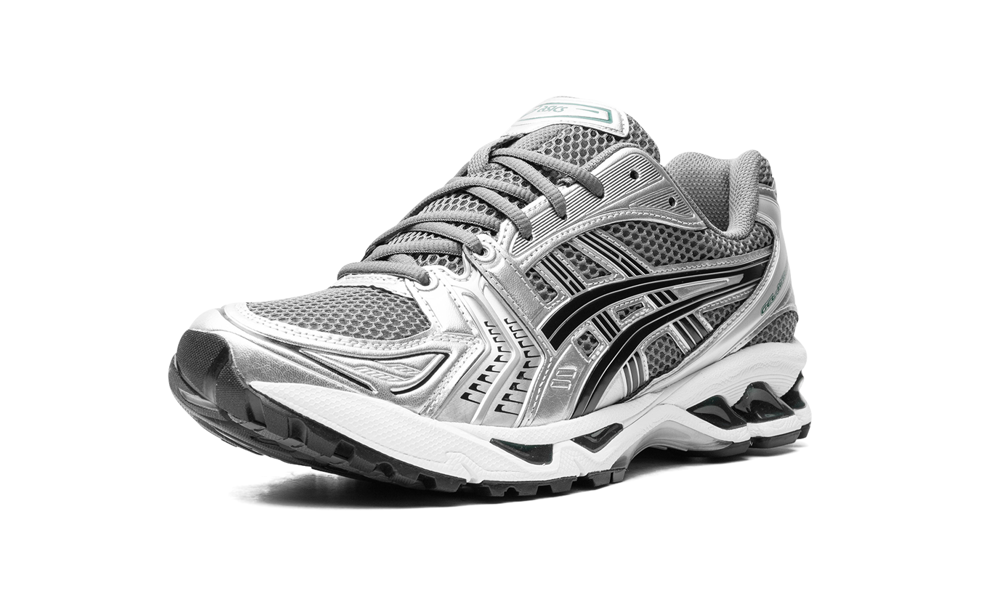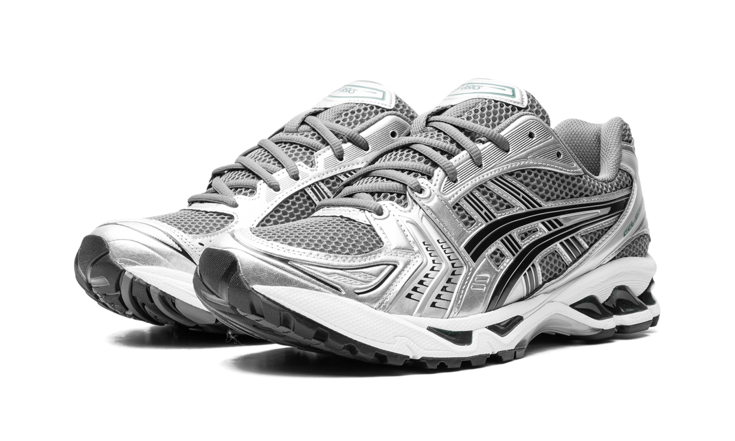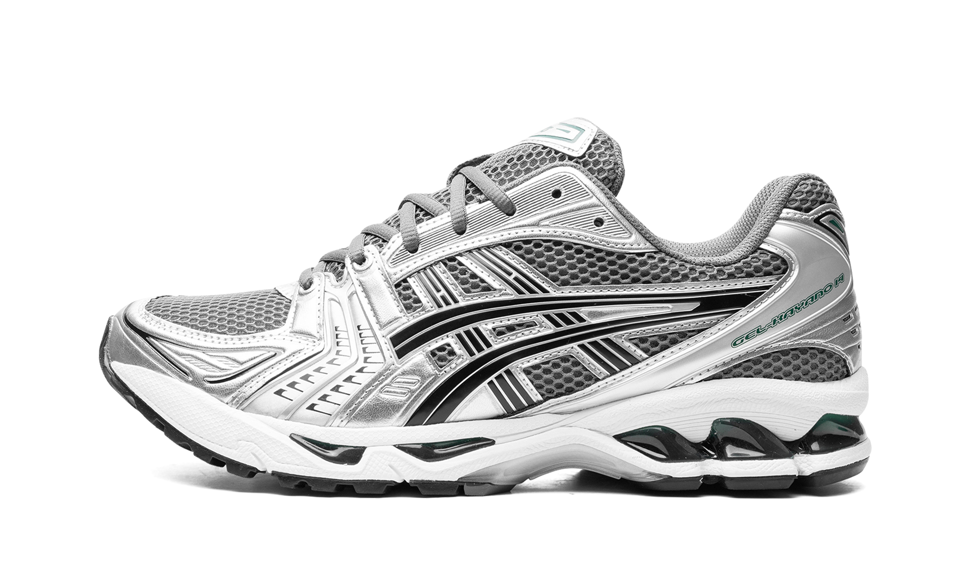 Discover the ASICS Gel-Kayano 14 "Jasper Green," a versatile retro running shoe with subtle green accents. Originally a performance silhouette, the Gel-Kayano 14 has gained popularity as a Y2K sneaker. This colorway features a Grey open-mesh upper with Metallic Silver synthetic leather overlays, complemented by Jasper Green detailing on the heel logo and tongue branding. ASICS's Gel cushioning technology completes the look.